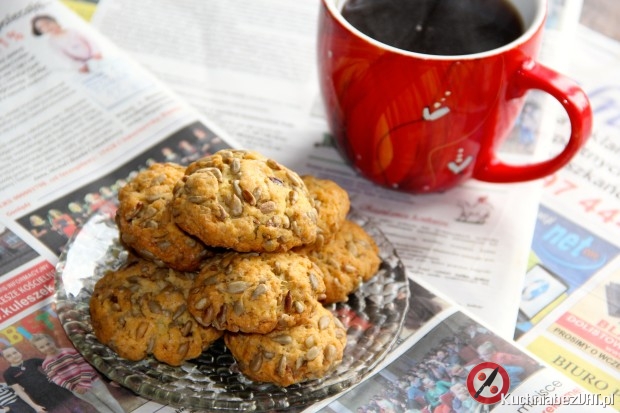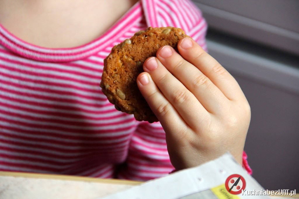 Ziarna słonecznika prażymy kilka minut na suchej patelni ciągle mieszając, żeby się nie przypaliły. Wszystkie składniki wrzucamy do miski i miksujemy. Następnie formujemy z masy małe kulki, lekko spłaszczamy i układamy na blasze wyłożonej papierem do pieczenia. Pieczemy przez około 15-20 minut w piekarniku rozgrzanym do 180 °C.
