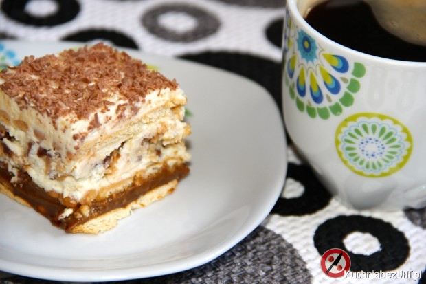 Blachę o wymiarach 25×30 cm wykładamy folią aluminiową (nie jest to konieczne) i układamy na niej warstwę herbatników. Przykrywamy je masą krówkową i układamy kolejną warstwę herbatników.